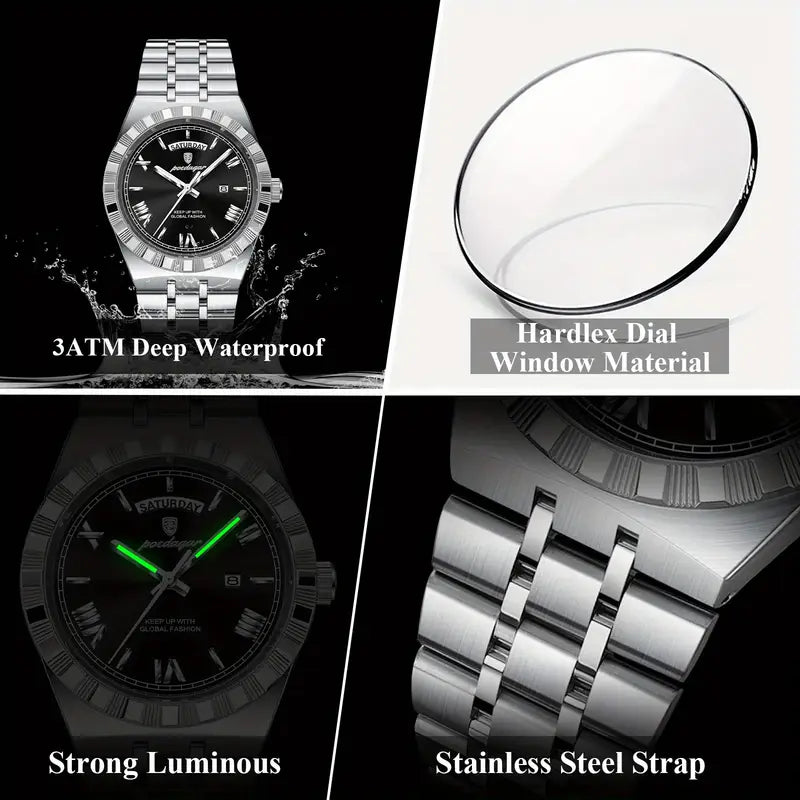 Diese hochwertige Quarzuhr ist mehr als nur ein funktionales Accessoire – sie ist ein stilvolles Statement am Handgelenk. Das klare, weiße Zifferblatt trifft auf ein gebürstetes Edelstahlgehäuse und ein komfortables Metallarmband. Ob im Büro, beim Ausgehen oder im Alltag – diese Uhr passt immer.