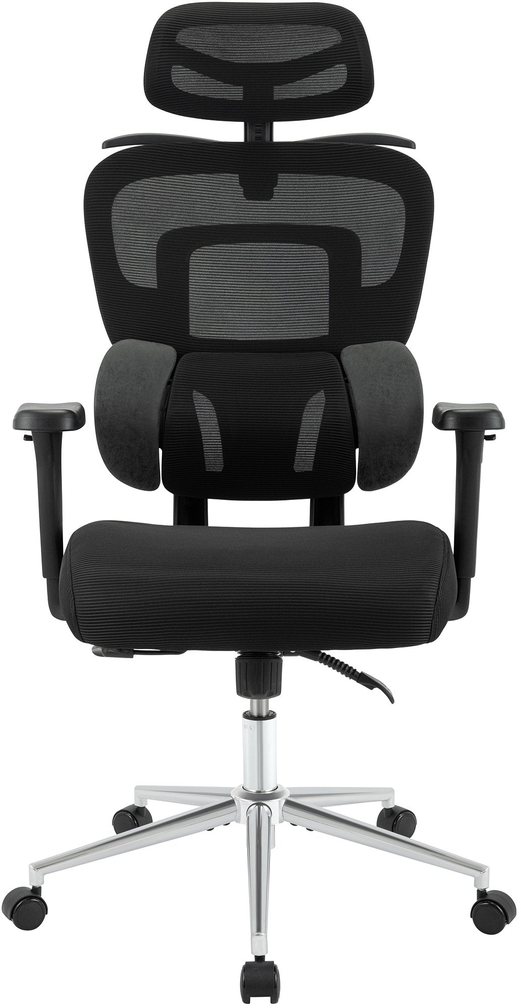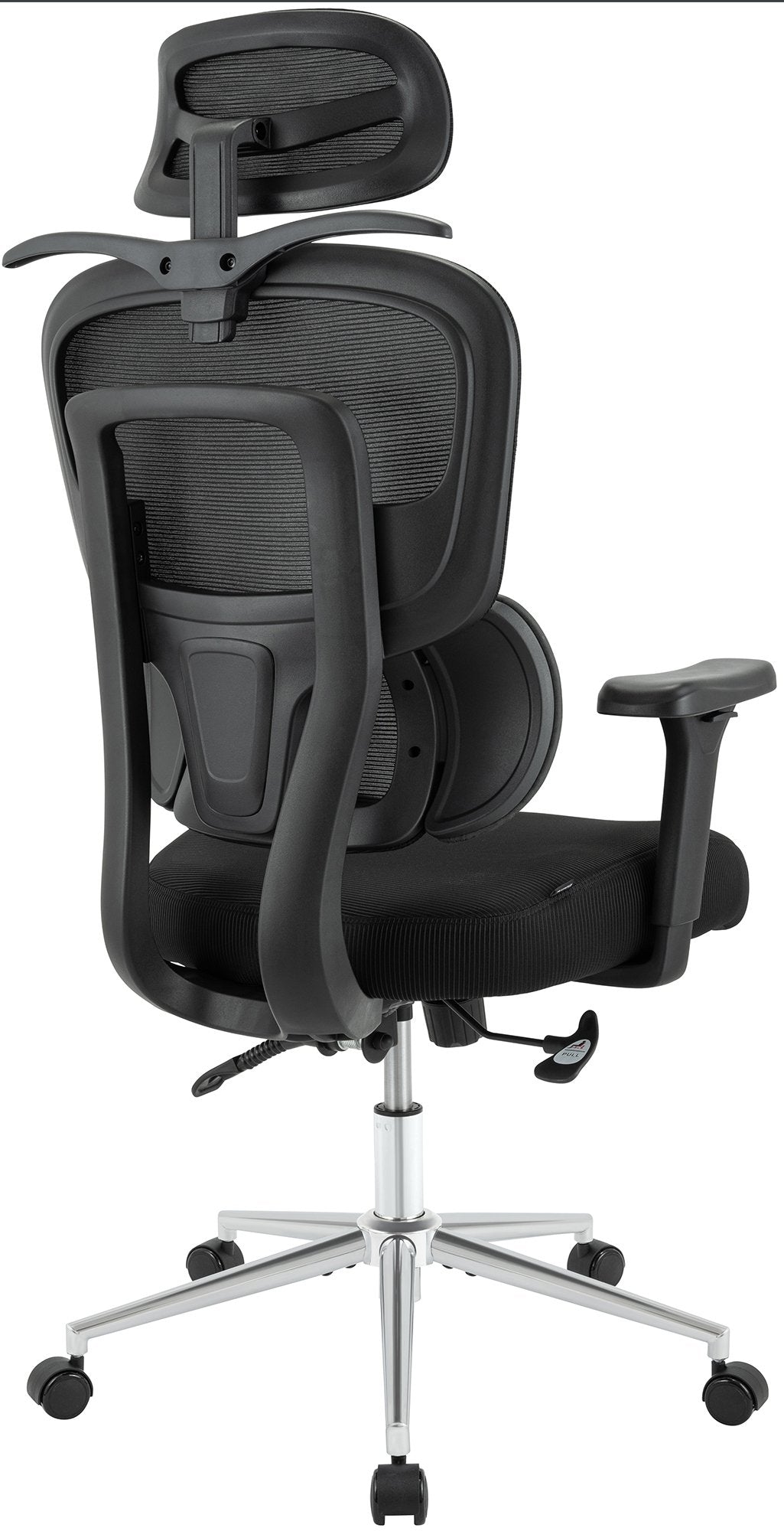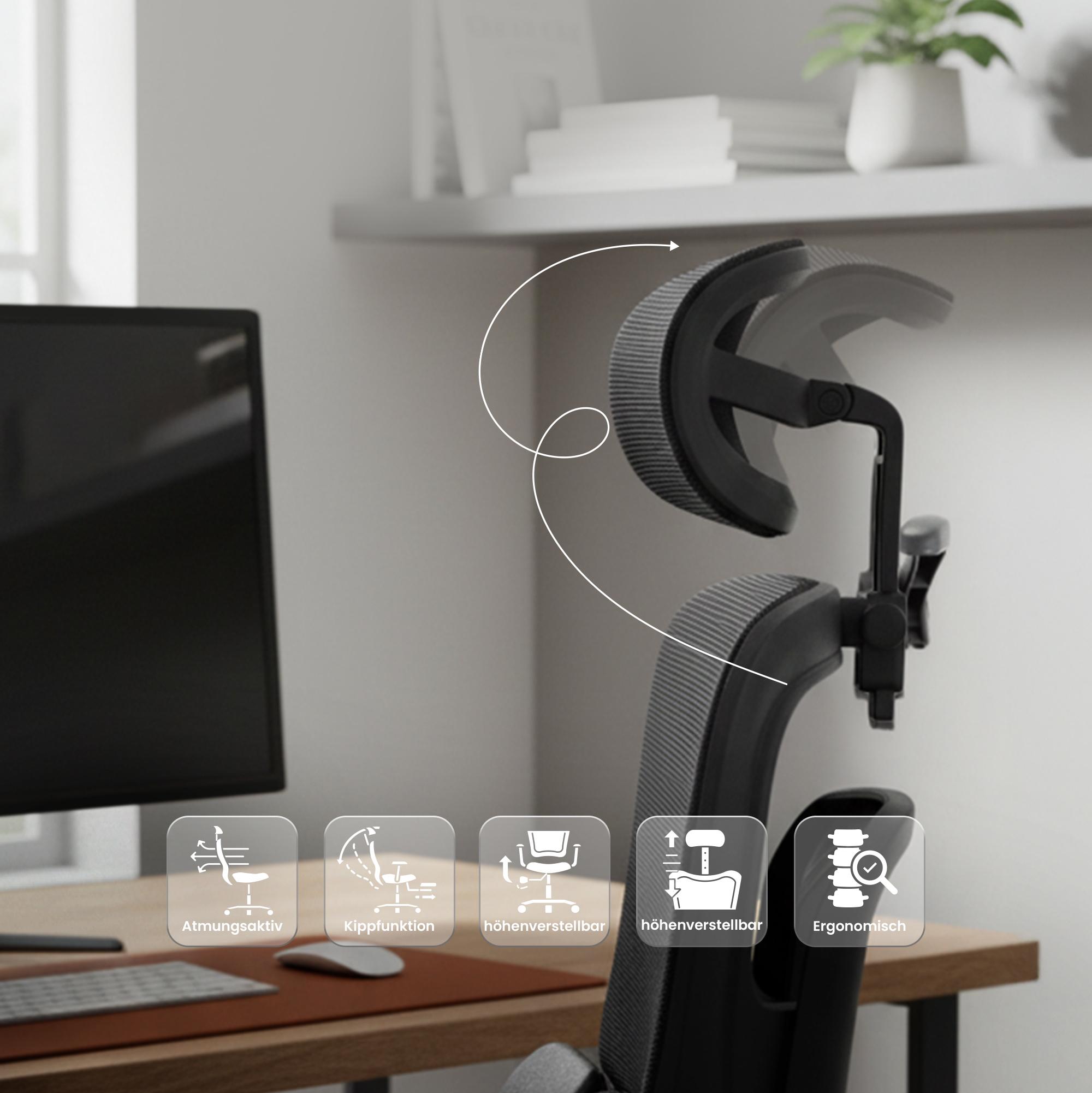 Die höhenverstellbare Kopfstütze lässt sich zusätzlich um 45° neigen und passt sich so jeder Kopfform optimal an. Die integrierte Lendenwirbelstütze entlastet gezielt den unteren Rücken und fördert eine gesunde Sitzhaltung.