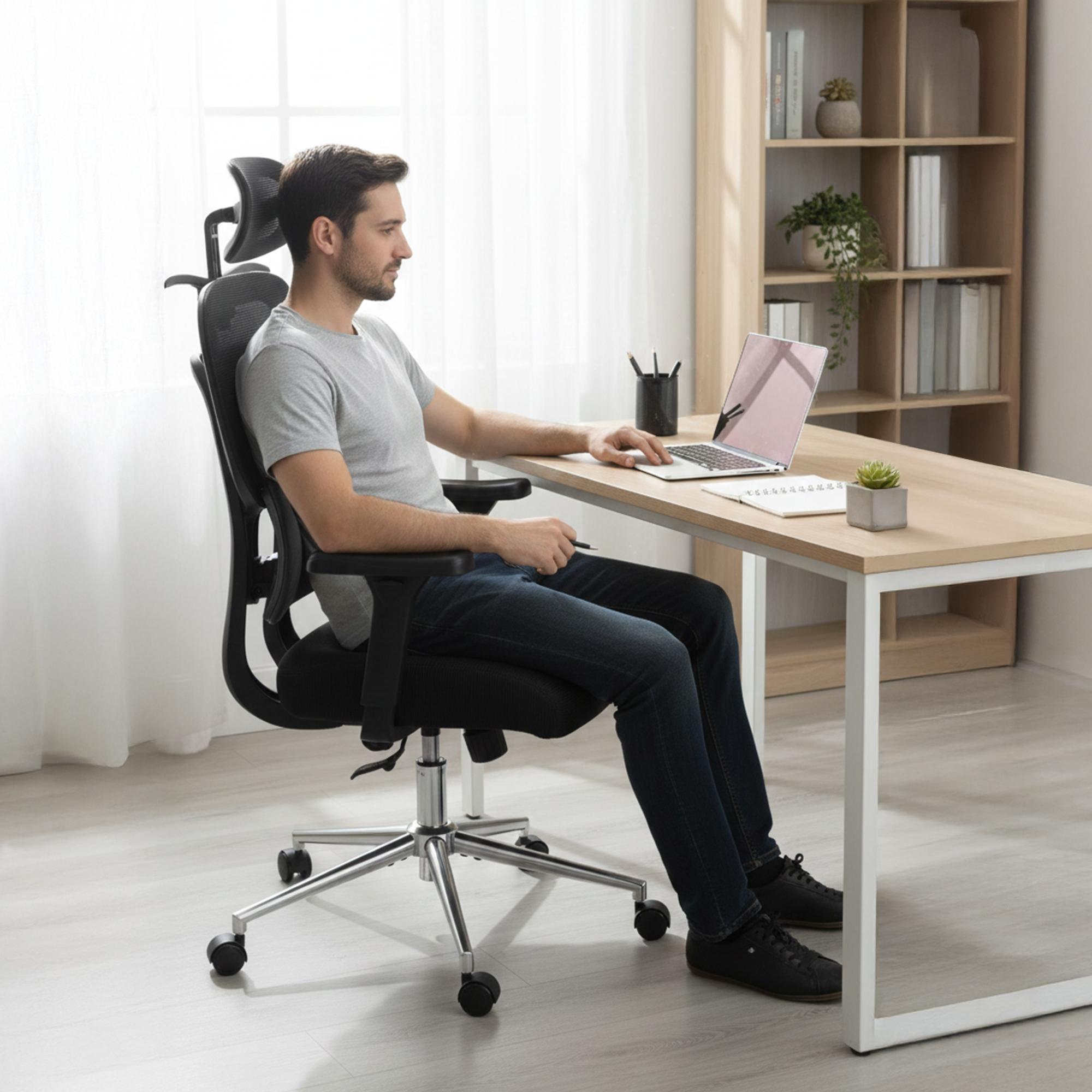 Für angenehmen Komfort sorgen die weich gepolsterte Sitzfläche und der atmungsaktive Netzbezug an Rückenlehne und Kopfstütze. Mit einer Tragfähigkeit von bis zu 150 kg ist der ergonomische Schreibtischstuhl Lothenda besonders robust und langlebig.
