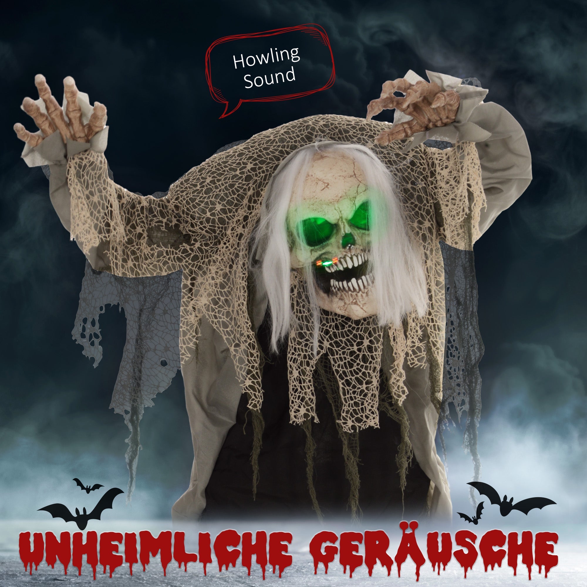 Dank Geräusch- und Berührungssensor erwacht die Figur sofort zum Leben: Der Kopf dreht sich, die Arme bewegen sich, die Augen leuchten gespenstisch, und ein unheimliches Heulen erfüllt den Raum. Zusätzlich können Sie die Animationen per Knopfdruck auch manuell aktivieren.