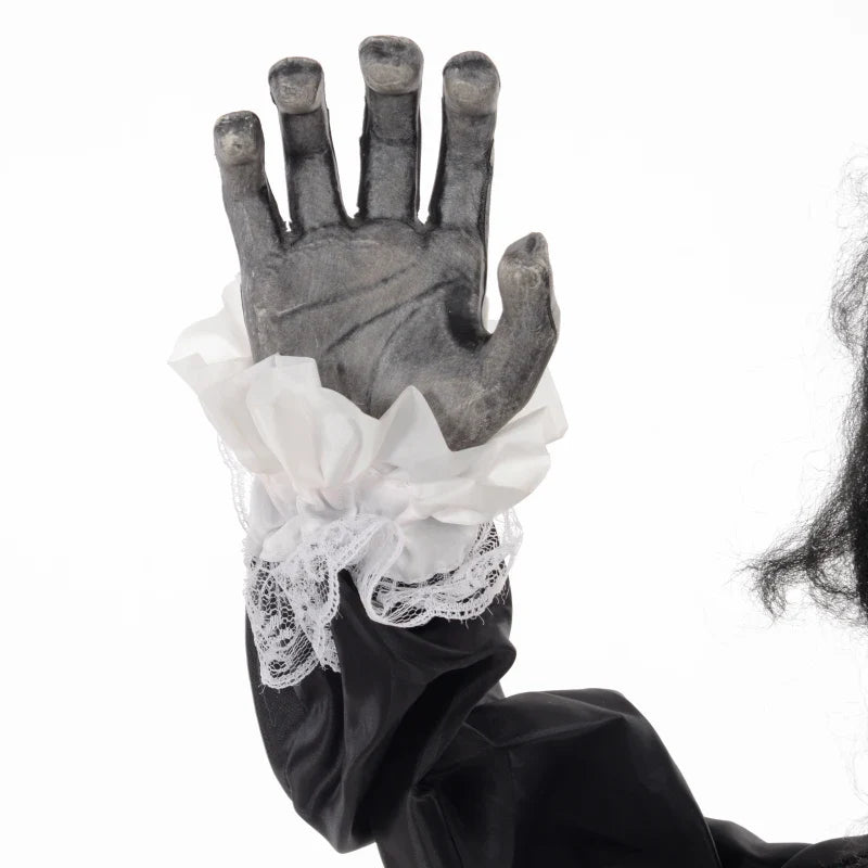 Diese unheimliche Figur sorgt für echte Gänsehaut: Das schwarze Lolita-Mädchen mit erschreckenden Risswunden zieht mit seinem furchteinflößenden Design alle Blicke auf sich. Sobald sich jemand nähert oder ein lautes Geräusch ertönt, beginnt der Kopf sich unheilvoll zu drehen. Gleichzeitig leuchten die Augen rot auf, während gespenstische Mädchenstimmen und Musik erklingen – perfekt, um in jedem Spukhaus eine gespenstische Atmosphäre zu erschaffen.
