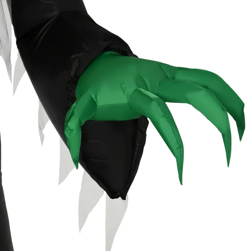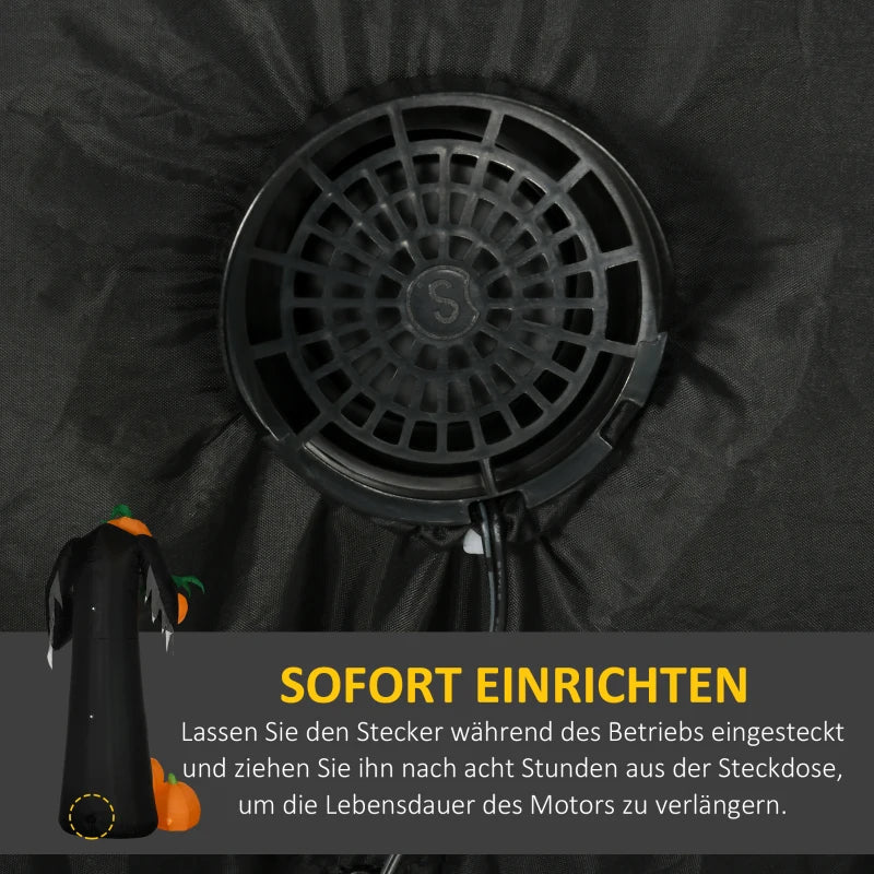 Der Aufbau ist kinderleicht: Einfach an das Stromnetz anschließen und die Figur richtet sich von selbst auf. Mit Heringen, Spannseilen und Sandsäcken steht die Deko auch bei leichtem Wind sicher. Das robuste, wasserabweisende Polyester (IP44) macht sie wetterfest und langlebig – perfekt für viele Halloweens in Folge.