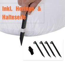 Komplettpaket: Im Lieferumfang enthalten sind ein drei Meter langes Anschlusskabel, ein integriertes Gebläse, zwei Abspannseile, drei Sandsäcke und vier Heringe zur sicheren Befestigung. Gesamtmaße: L80 x B40 x H180 cm.