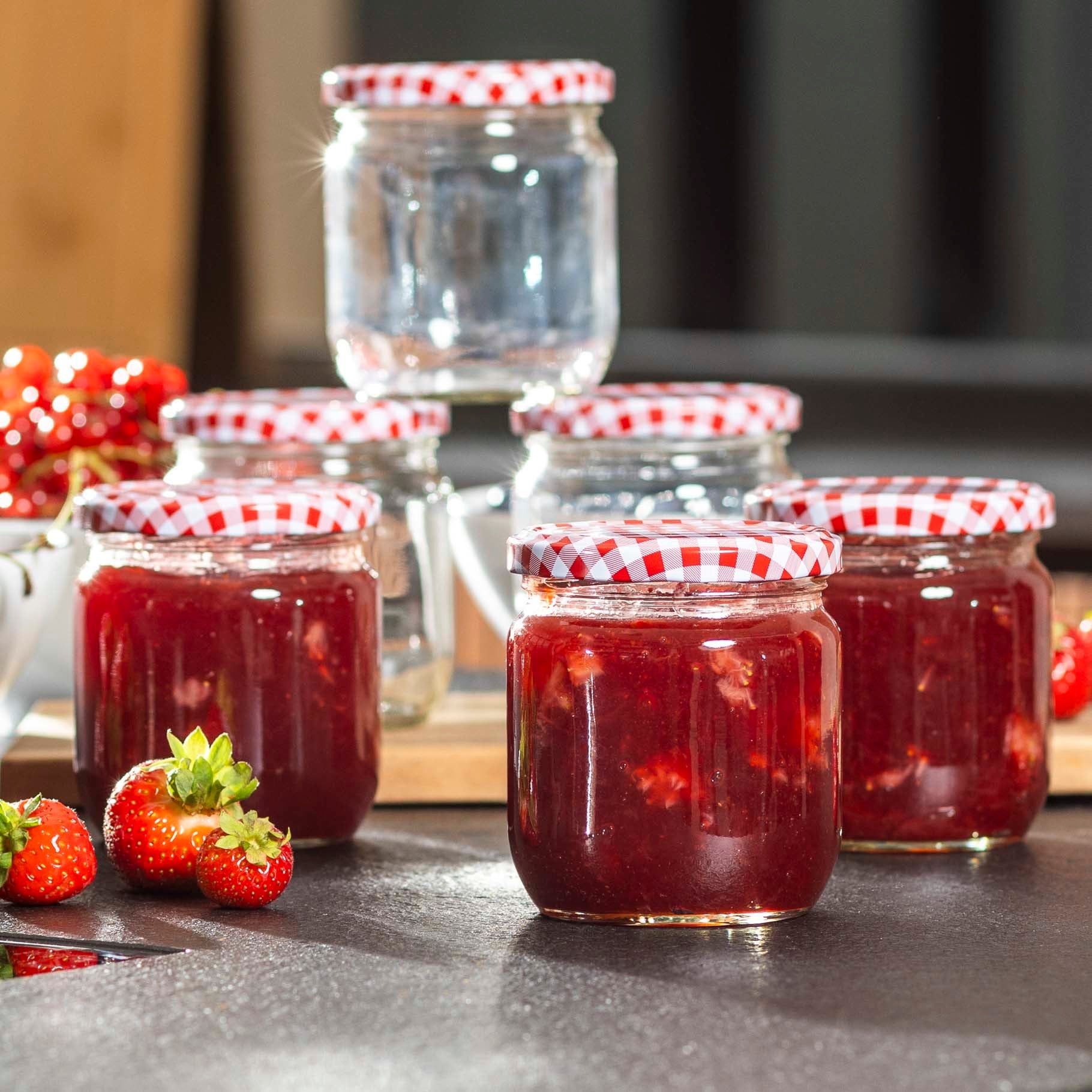 Dieses Set umfasst 6 Einmachgläser mit je 425 ml Fassungsvermögen – ideal für Marmeladen, Aufstriche, Gewürze und vieles mehr. Die Gläser sind praktisch, leicht und platzsparend, perfekt zum Selbermachen und Abfüllen von hausgemachten Köstlichkeiten. Ob als kleine Kostproben, zum Verschenken oder Verkaufen – dieses Set ist ein vielseitiger Helfer in der Küche.