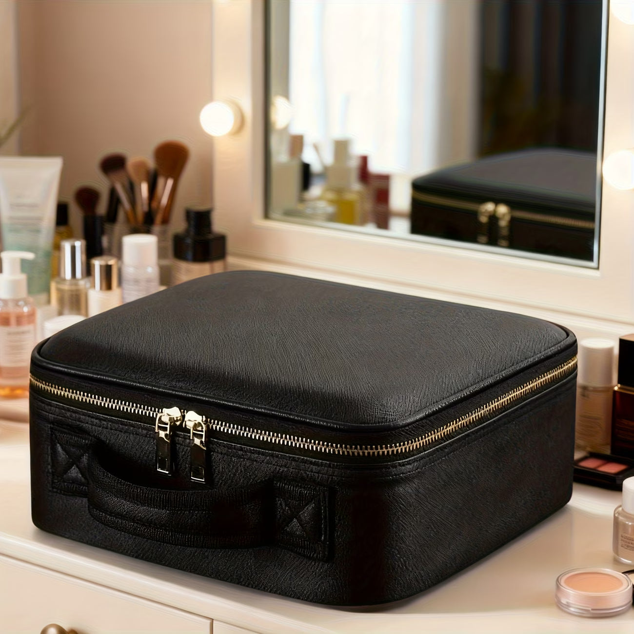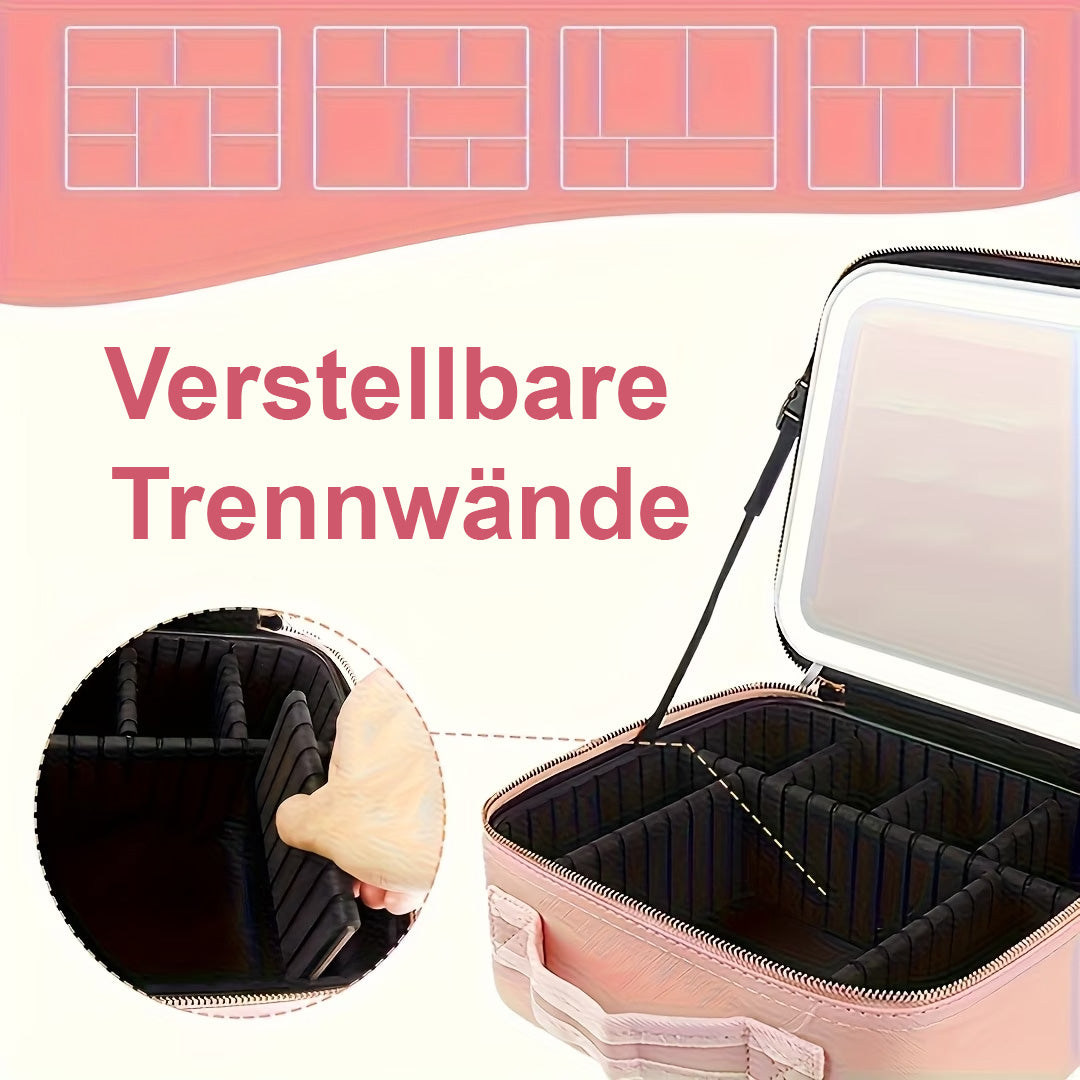 Die Premium Kosmetiktasche kombiniert elegantes Design mit durchdachter Funktionalität. Dank integriertem Doppelspiegel, variabler Fächeraufteilung und hochwertiger Verarbeitung ist sie der ideale Begleiter für Alltag, Reisen und Business.