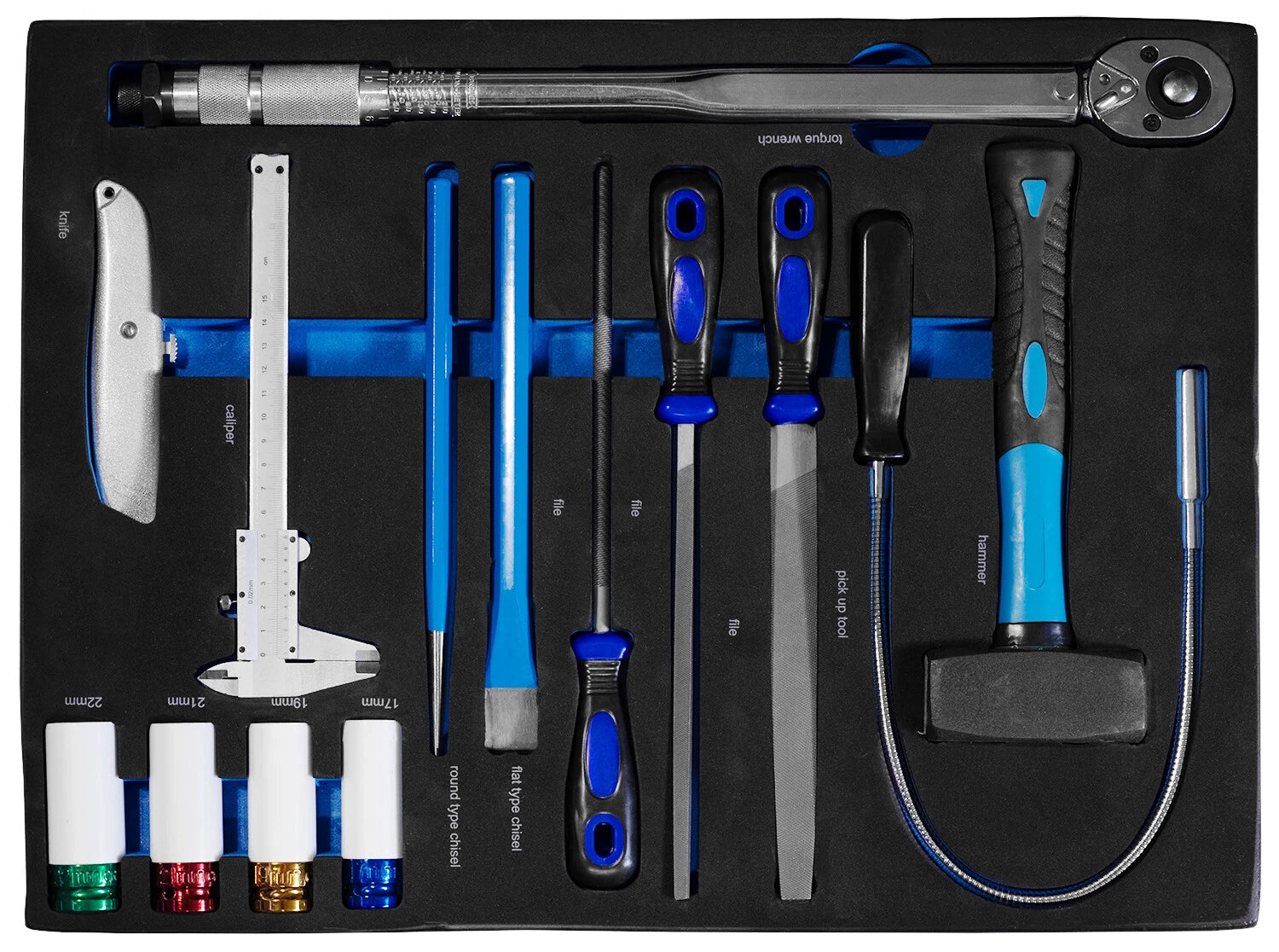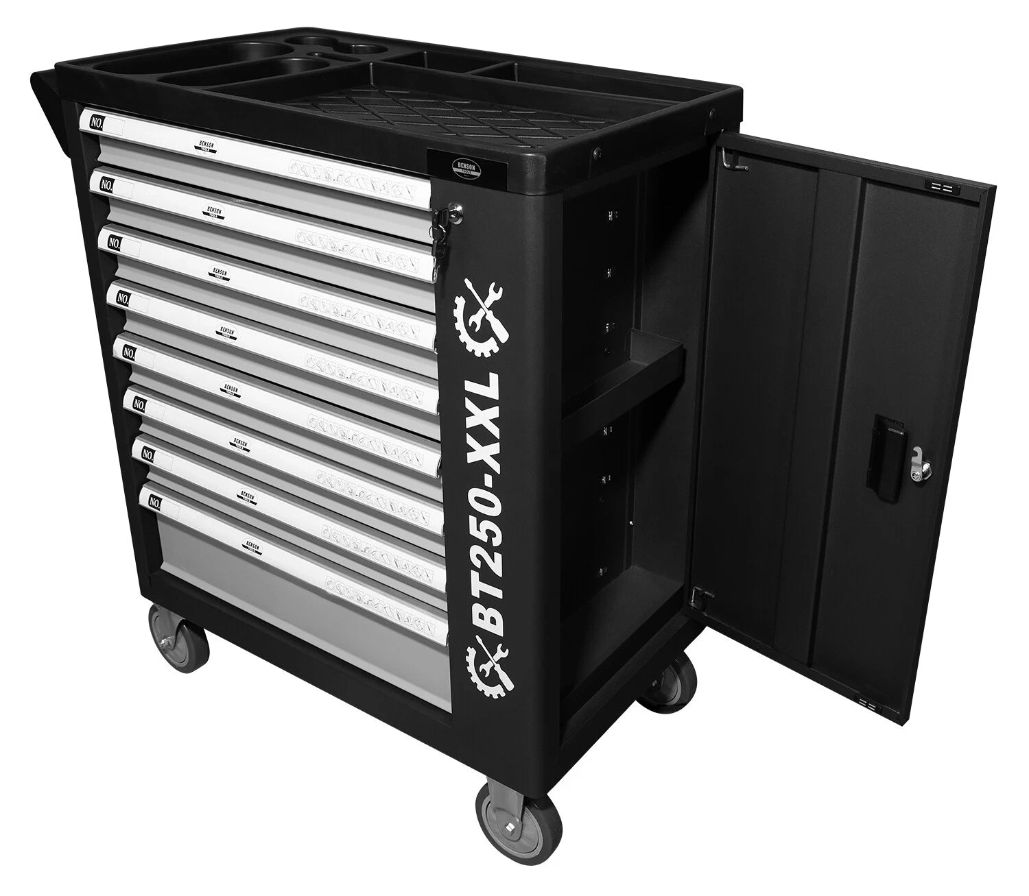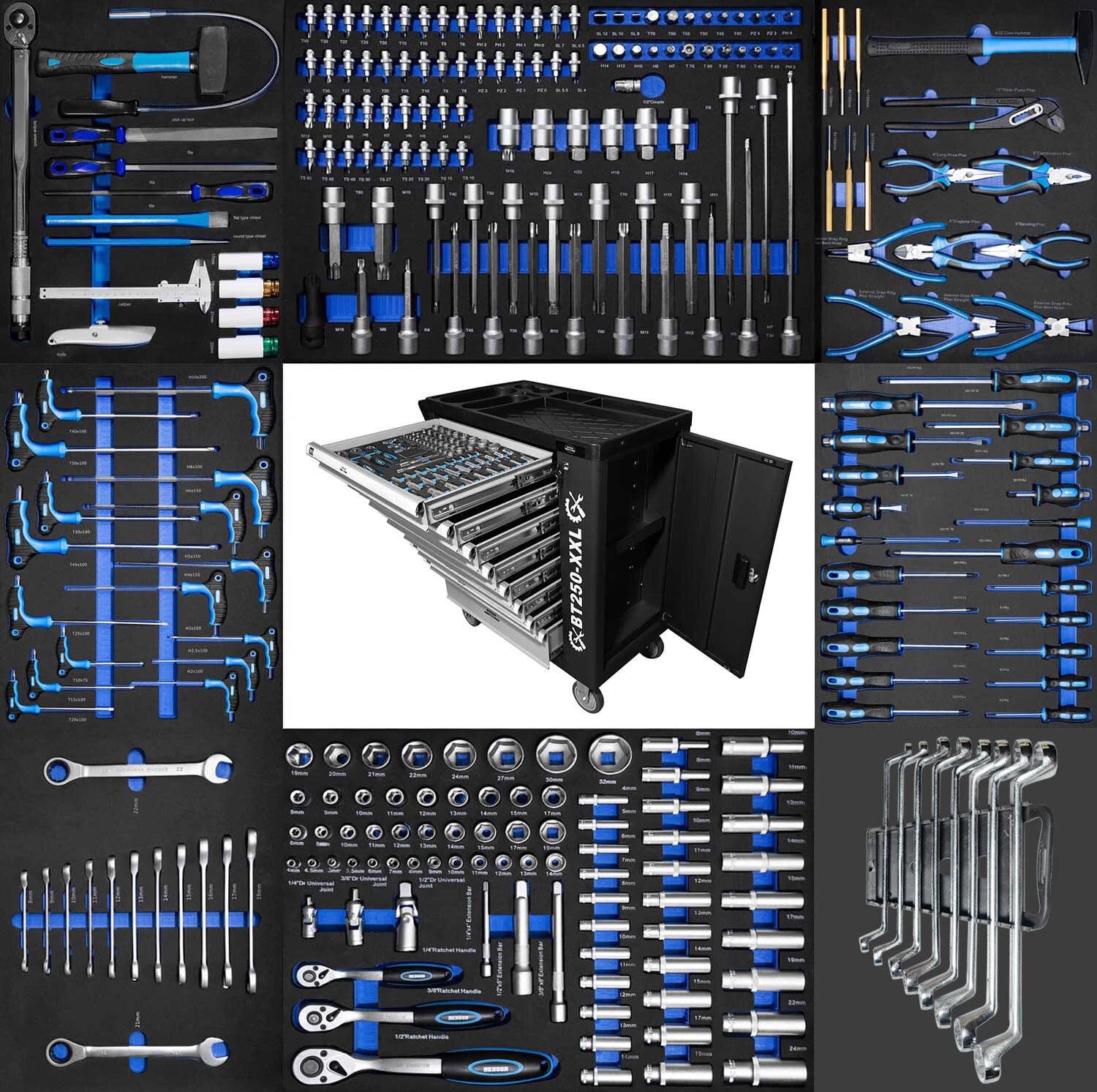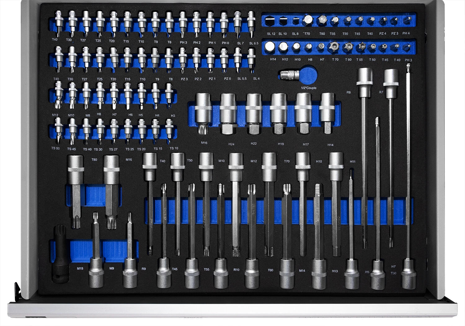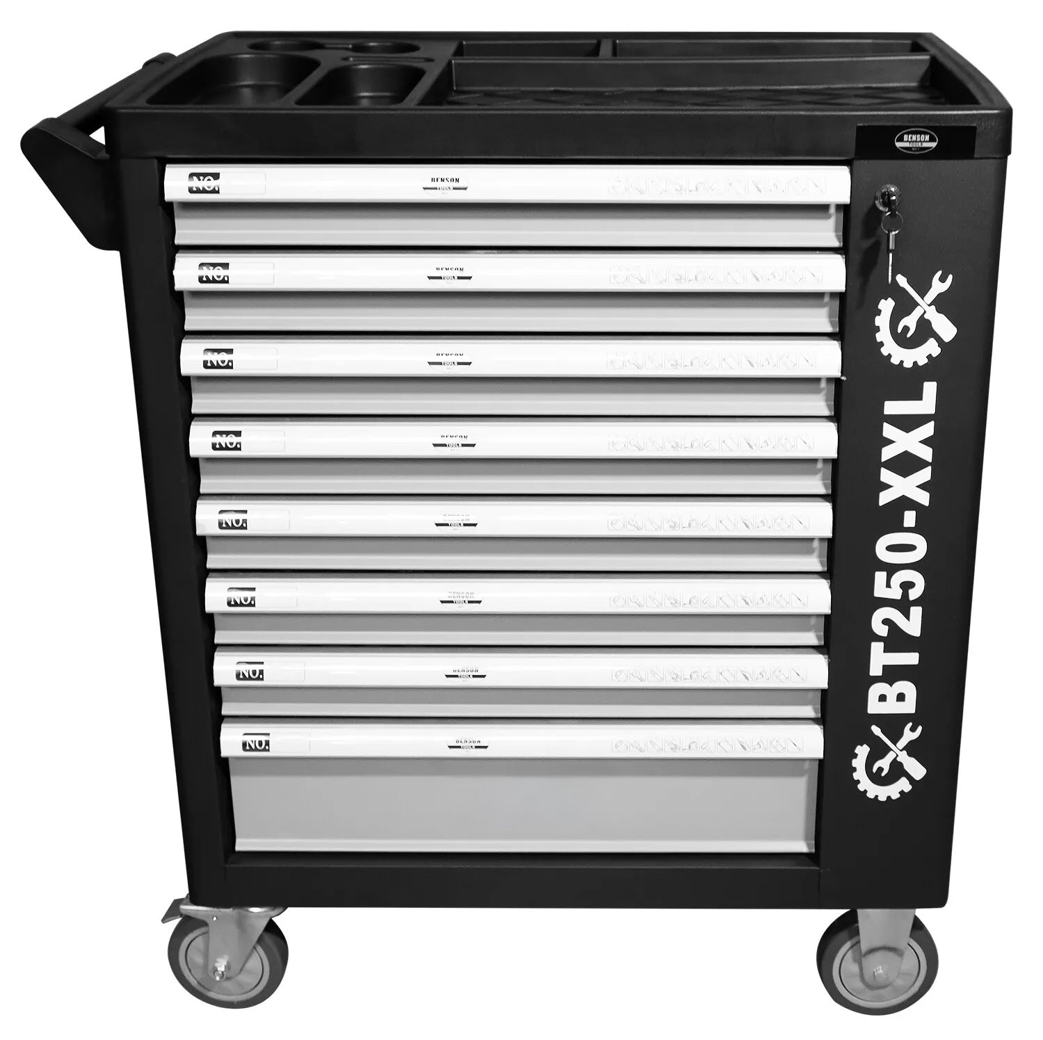 Hochwertiger, vollständig bestückter Werkstattwagen mit 8 Schubladen mit präzise sortiertem Profi-Werkzeug. Jede Schublade ist systematisch beschriftet, sauber eingelegt und sofort einsatzbereit. (Gewicht 89 kg - Lieferung komplett per Spedition ohne Mehrkosten.)